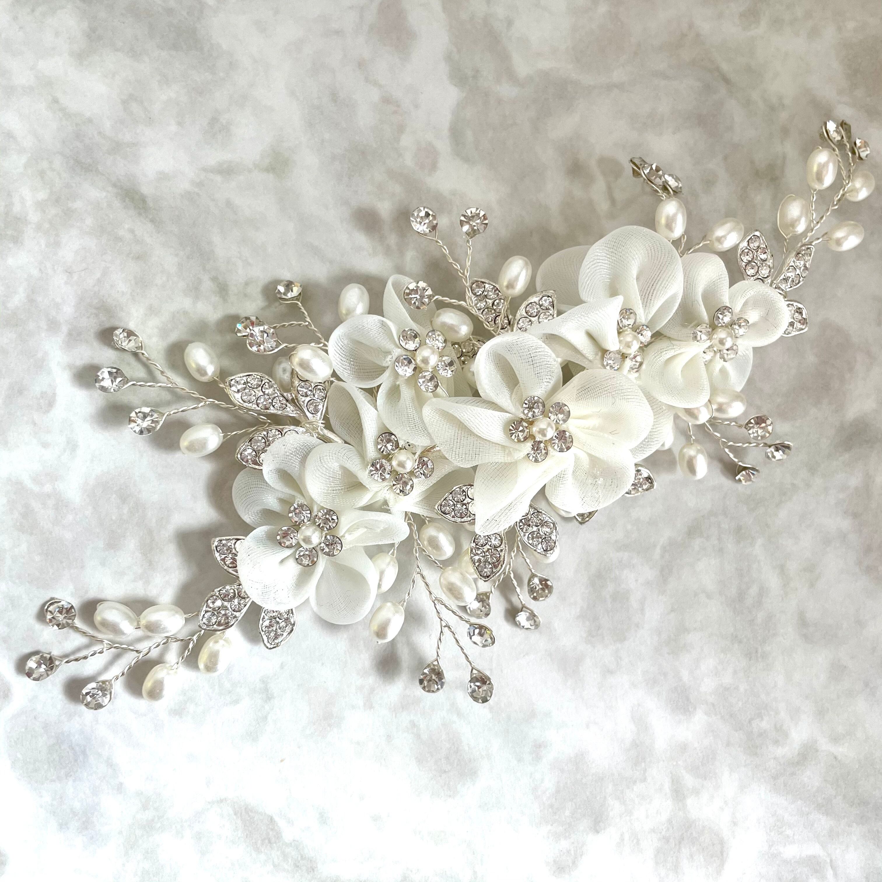 ふわふわのオーガンジーのお花からキラキラのラインストーンやパールがまばゆいほど散りばめられたヘッドドレスです♡