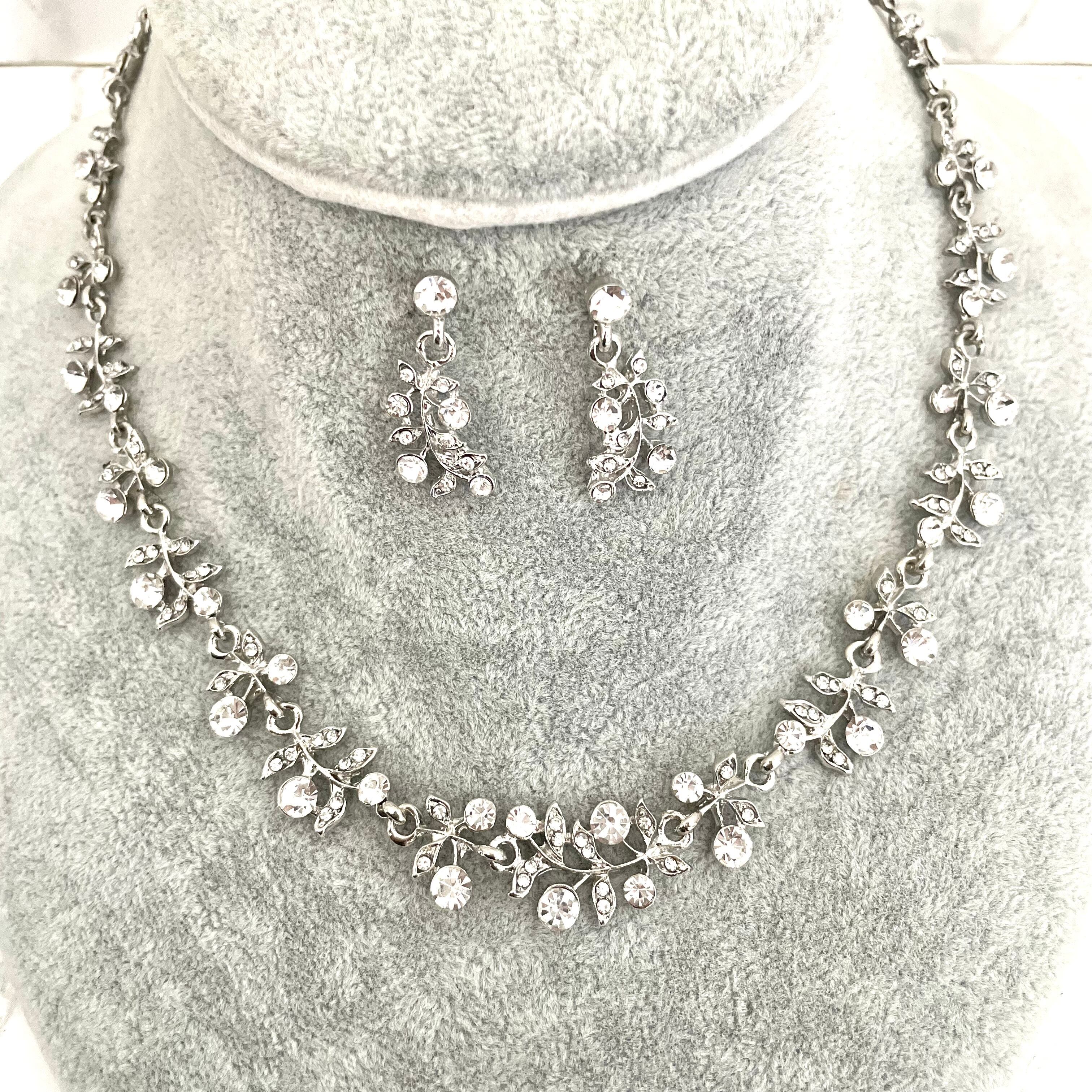 華やかなビジューネックレスとピアスのセットです。ブライダルシーンだけでなく、パーティーや特別なイベントにもぴったりのアクセサリーです。華やかななアクセサリーが、あなたの輝きを一層引き立てます。
